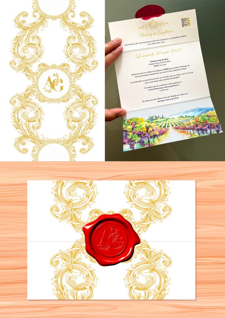J’ai eu le plaisir de concevoir ce faire-part de mariage pour mon fils et ma belle-fille. Le résultat s’est voulu à la hauteur de leurs attentes : une création à la fois élégante et sophistiquée, pensée dans les moindres détails. Le verso du faire-part, une fois ouvert, était habillé de motifs vectoriels ornementaux d’une grande finesse, apportant richesse et délicatesse à la composition. Chaque exemplaire a été refermé à la main par un sceau de cire rouge, ajoutant une dimension précieuse et artisanale à l’ensemble. Ce bel objet, conçu comme une pièce d’exception, restera un souvenir intemporel de cette journée unique.