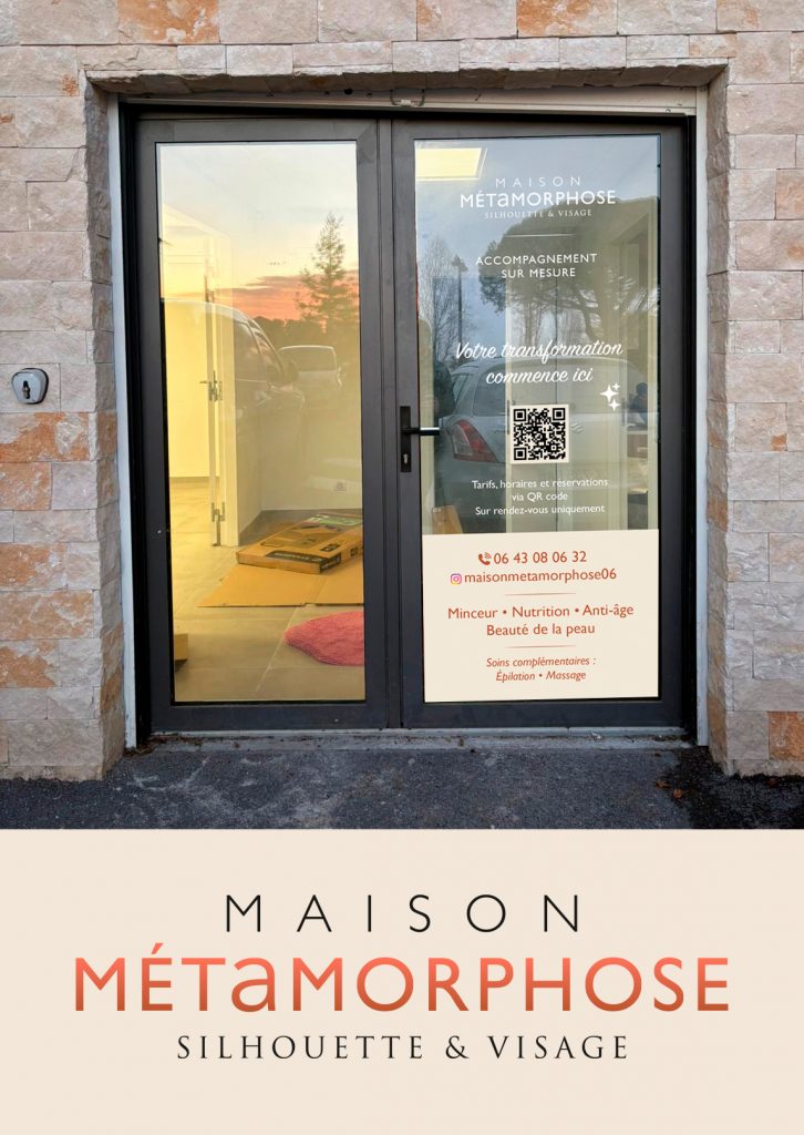 Marine Flamant n’est pas une esthéticienne comme les autres. Forte de plus de dix ans d’expérience, elle propose bien plus que des prestations de soins : un véritable accompagnement vers une transformation intérieure. C’est dans cet esprit qu’est née l’identité visuelle de Maison Métamorphose, un logo pensé pour traduire cette évolution en douceur et en profondeur. J’ai accompagné ma cliente lors de son installation dans un nouveau local à Nice. Des vitrophanies ont été réalisées sur la porte vitrée ainsi que sur la vitrine, afin d’affirmer la présence et l’univers de la marque dès l’extérieur.