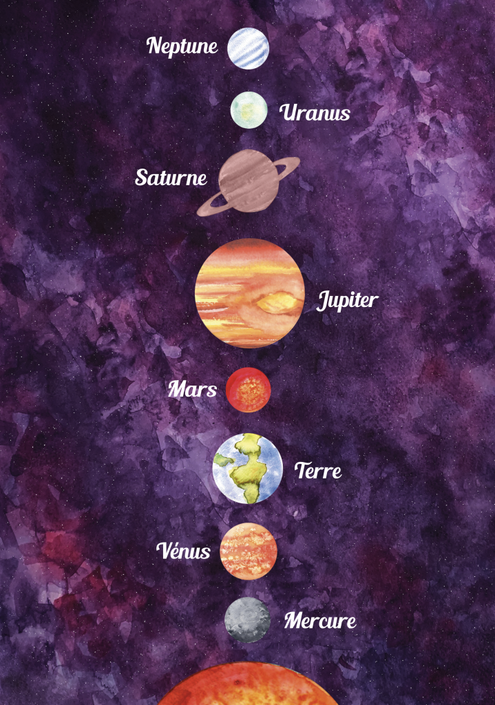 Cette affiche du système solaire, au format A3, a été entièrement réalisée à la main dans sa conception initiale. J’ai peint chaque élément séparément à l’aquarelle — les planètes ainsi que le fond — afin de préserver la richesse des textures et la spontanéité du geste. Après numérisation, j’ai effectué les retouches et le montage sur Photoshop pour harmoniser l’ensemble et affiner les détails. Le résultat a rencontré un vif succès auprès de ma cliente : l’affiche était destinée à devenir un cadeau d’anniversaire unique pour une petite fille de 6 ans.