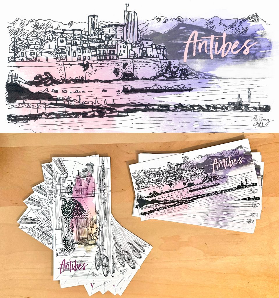 J’ai dessiné ce lieu magnifique où j’ai la chance de vivre : la plage d’Antibes — entre la Salis et le Ponteil — avec les remparts en arrière-plan. À partir de ce croquis initial, j’ai créé une carte postale au format long. L’illustration a été réalisée à l’encre noire, puis mise en couleurs sur Photoshop afin d’apporter profondeur et luminosité à la composition. L’impression a été confiée à Vistaprint.