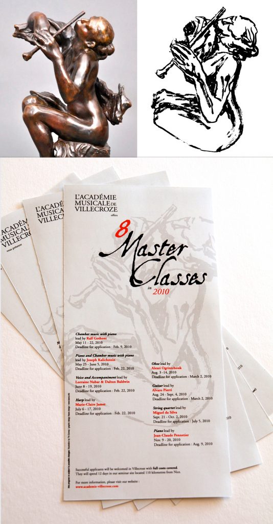J’ai réalisé une illustration à l’encre de Chine représentant une flûtiste, destinée à la création d’une affiche et d’un flyer. Cette commande m’a été confiée par l’Académie musicale de Villecroze à Paris. Le dessin s’inspire d’une photographie d’une statue de Camille Claudel, dont j’ai réinterprété les lignes avec sensibilité et élégance. Ces supports imprimés ont servi à promouvoir neuf « master classes » organisées par l’Académie. Le projet a rencontré un accueil très positif et a été particulièrement apprécié par le client.