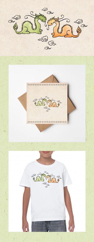 J’ai eu la joie de concevoir le faire-part de naissance des jumeaux d’une amie. Elle souhaitait représenter ses bébés sous la forme de deux dragons de couleurs différentes, afin de symboliser le fait qu’il s’agit de faux jumeaux. Nous avons choisi ensemble une palette de tons pastel, doux et harmonieux : un orange délicat et un vert tendre, deux couleurs complémentaires qui dialoguent avec subtilité. Les illustrations ont également été déclinées pour une impression sur t-shirts, prolongeant ainsi l’univers graphique du faire-part.