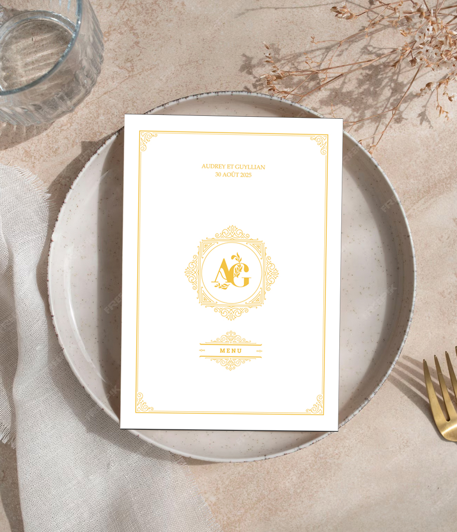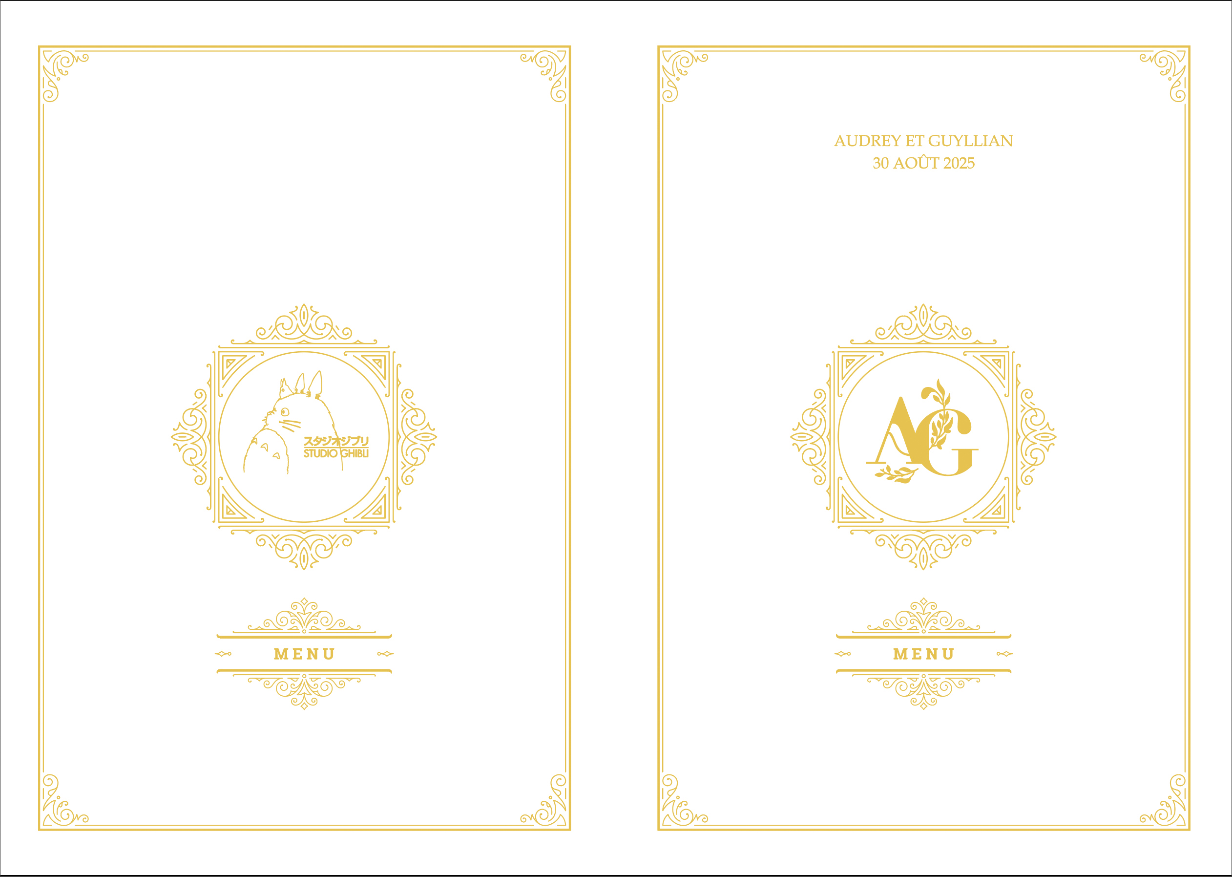Menu de mariage de Guyllian Gomez en 2025 : format A4 ouvert.