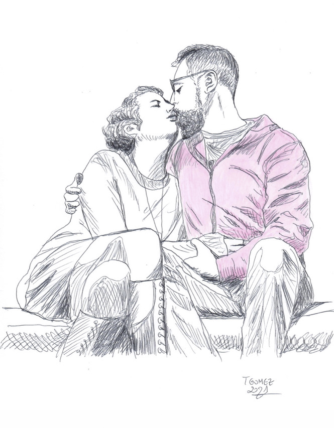 Leur groupe porte un nom plein de douceur : Fools in Love. Leur univers musical est unique, mêlant humour, autodérision, piano et batterie. Madame chante également et s’accompagne au clavier, ajoutant encore plus de sensibilité à leurs compositions. Ce dessin est inspiré d’une photo de Pierre-Antoine Sims.