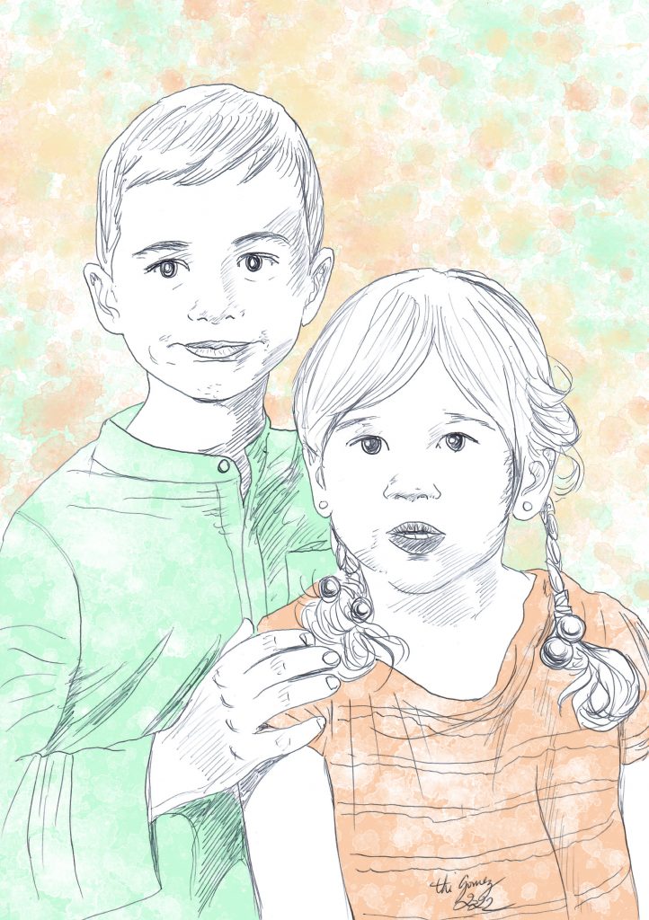 Ce double portrait d’enfants est une commande d’une amie de l’association des Elles d’Antibes. Il s’agit de ses deux enfants — elle a eu le choix du roi : un garçon et une fille ! J’ai eu la chance de les rencontrer une fois. Dans le dessin, on ne perçoit pas entièrement leur côté espiègle, coquin et malicieux, pourtant si présent dans la réalité…